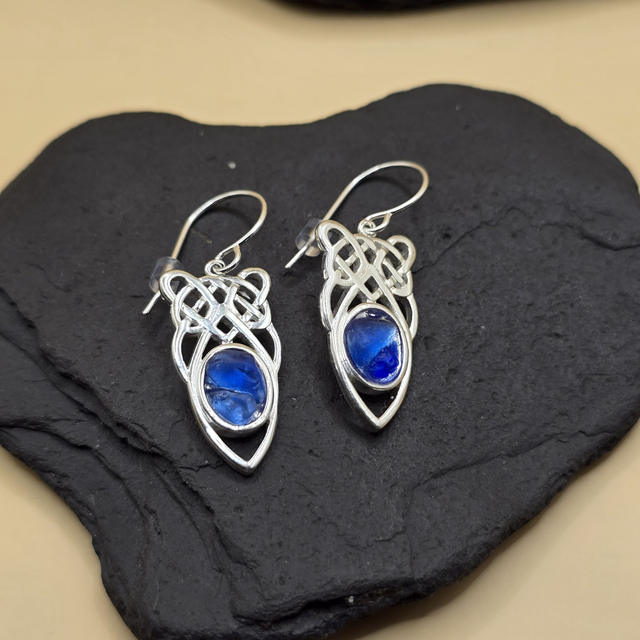 Statement earrings crafted from solid sterling silver, featuring intricate Celtic knotwork and striking blue Scottish seaglass drops.